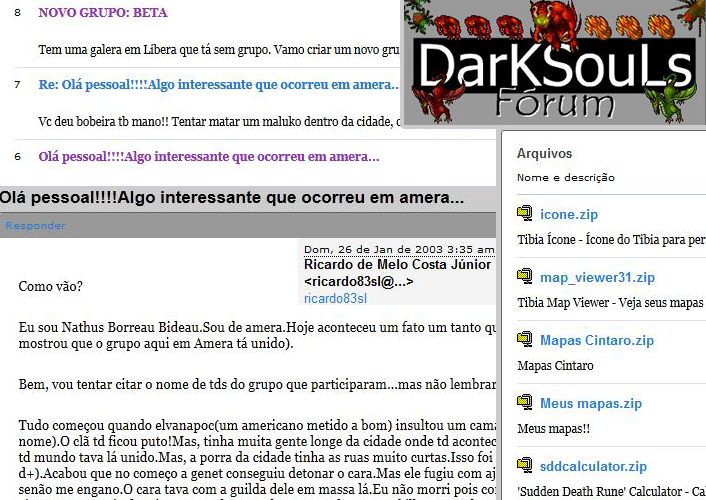 Algumas coisas ficaram de fora N1trous algo assim sei la no nick do cara, tbm foi adm do pt, o cara q copiou uma skin e disse q ele tinha criado ela e tals e foi tirado do poder, criou um outro forum panda n sei o q com alguns users do forum, 1 semana depois ele passou a perna em td mundo e o forum foi fechado kkkk! o pq da grande rixa com o tibiabr e mtas outras coisas mais mesmo assim foi bem bacana relembrar td isso.