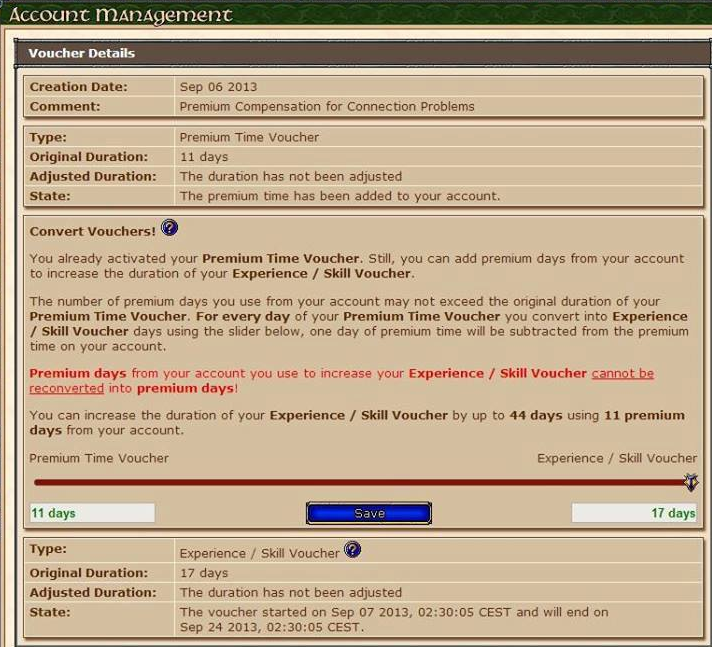 4º Se, em 06 de setembro você ativou seu voucher de premium time sem fazer a conversão, você ainda pode converte-los em dias de double. Mas, apenas estes dias premium do voucher. Os dias de premium do voucher “gastos” pela ativação “errada”, você também pode converte-los em dias de double XP/skills, desde que haja premium time comum ativa na conta. Neste caso, o sistema fará automaticamente a permuta X dias premium comum <--> X dias premium voucher, mas não será possível ter dias de premium voucher a mais do que os dias inicialmente compensados.