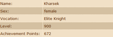 O jogador Kharsek mais uma vez escreveu o seu nome na história do Tibia, além de ser o primeiro jogador a alcançar os levels 700 e 800, o jogador também possui em seu histórico de conquistas como o primeiro brasileiro a chegar aos níveis 600, 700, 800 e agora, ao incrível level 900.