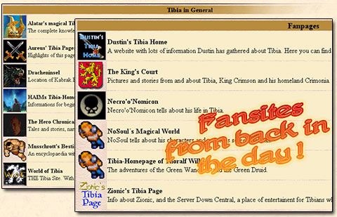 Se avançarmos no tempo em uns dois anos, e olharmos o site de Tibia na época, podemos ver que não somente o jogo evoluiu muito, mas havia muito fansites também. É claro, muitos fansites não estão mais online, mas surpreendemente, alguns estão. Dê uma olhada na imagem abaixo, do antigo site do Tibia. Você se lembra ou reconhece algum destes fansites?