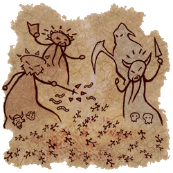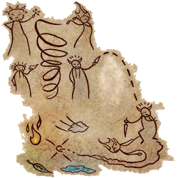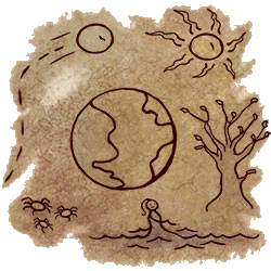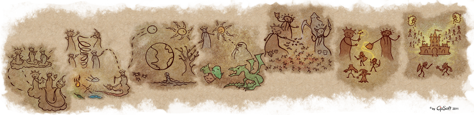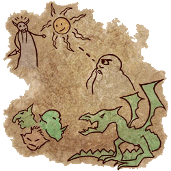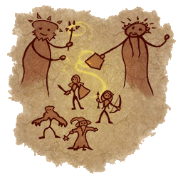“Meu testamento? Claro que não! Pode abrir.” Eu dei-lhe um aceno encorajador. Ela abriu o pergaminho com muito cuidado e seus olhos se arregalaram de surpresa. E então, ela riu. “Mas por que você carrega um pergaminho cheio de rabiscos de uma criança?!” Ela apontou para os simples esboços no pergaminho. “Bem, eu fiz esses desenhos. Eu tentei imitar pinturas rupestres. Para dar aquele olhar antigo.” Ela riu. “Mas… o que é isso? O que elas mostram? Hmm, eu sinto uma história aqui, Amaro!” Suspirei e me sentei ao lado dela. “Vani, você quer ser uma aventureira, mas você não sabe nada sobre seu passado.” Eu peguei o pergaminho dela e coloquei no chão próximo de nós. “Elas mostram seu passado. Meu passado. O passado de todos os Tibianos. O gênesis!” Vani franziu a testa: “O gênesis? Ewwww! Eu não gosto de aulas de história, Amaro. Elas são muito chatas.” “Você então não tem nenhuma idéia sobre o gênesis. É cheio de grandes histórias, emoções, batalhas sangrentas, criaturas ferozes, momentos heróicos… Nenhuma das minhas aventureiras chegam perto das proporções épicas do gênesis. “Minha voz ecoou pela noite. Vani riu defensivamente. “Certo, certo, Amaro. Conte-me o espírito da coisa. Mas não me dê a mesma velha história que você encontra em livros ou vou adormecer em alguns minutos. Eu gostaria de algum drama e ação, você sabe.” “Então o gênesis é o lugar certo para isso. Aqui,” Eu apontei para o pergaminho, “meus humildes desenhos vão nos guiar durante a noite.”