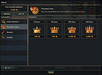 - Aqui você pode comprar Premium Time de 30, 90, 180 ou 360 dias. O Premium Time comprado por Tibia Coins pela Store será ativado imediatamente e, ao contrário dos demais produtos, se aplicará a toda a sua conta, é claro. Então, o status de Premium ficará a apenas um clique, não sendo necessário um novo login para ativá-lo.