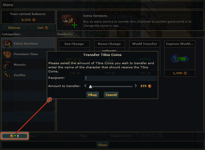 Se quiser alterar o nome, sexo ou o mundo do seu personagem, você pode encontrar o respectivo serviço extra nessa categoria. Assim que comprar uma Mudança de Sexo de Personagem, seu personagem terá seu sexo alterado instantaneamente. Quando comprar uma Mudança de Nome de Personagem, você terá que escrever o novo nome do seu personagem. Se o nome estiver disponível e você confirmar a compra, você apenas terá que reabrir seu client para finalizar a mudança e caminhar pelas terras tibianas com seu novo nome. Transferências de Mundo permitem que você transfira seu personagem para outro mundo. Enquanto a compra de uma Transferência iniciará o processo de mudança do seu personagem, você ainda precisará fazer login na sua conta pelo site oficial para selecionar o mundo ao qual deseja ir, além de preparar seu personagem ingame para completar a Transferência de Mundo.