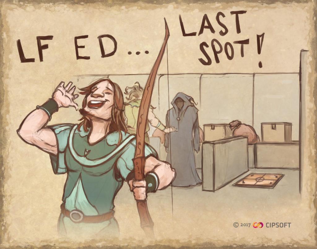 “Acho que é a hora de encontrarmos um substituto temporário para o Emilio. Não faz sentindo sentirmos culpa. Vamos fazer esta caça para honrar Emilio!” Tibicus tentou motivar o restante dos membros de sua equipe. Só havia um problema. Nenhum deles conhecia um elder druid com habilidades comparáveis as de Emilio. “Eu já ouvi sobre um método muito comum para encontrar pessoas para uma caçada.” – disse Fridolin. “Eu mesmo nunca o fiz, mas acho que vale a tentativa.” Ele virou e foi até o meio do depósito, limpou sua garganta e gritou no limite de seus pulmões: “FALTA ED… ÚLTIMA VAGA!”