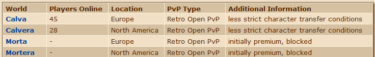Calva e Calvera já estão on-line com suas novas características. Notem que eles estão abertos para transferências irrestritas, ou seja, personagem de qualquer tipo de mundo podem solicitar transferências para lá. Contudo, uma vez lá, não será mais possível retornar o personagem para mundos Hardcore PvP.
