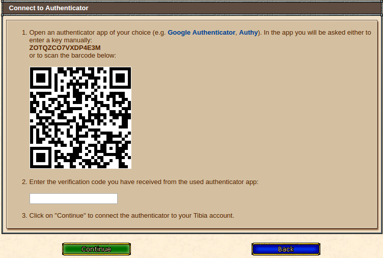 Informações importantes: Se ignorar esta mensagem, poderá perder a sua conta do Tibia. Antes de conectar sua conta a um autenticador, certifique-se de ter uma Recovery Key válida. Se não tiver uma Recovey Key válida, obtenha uma antes de conectar a sua conta a um autenticador.