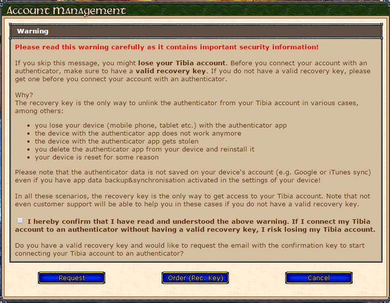- Sistema de Autenticação: Adição de uma checkbox à página da conta. E esta checkbox tem a intenção de alertar e informar ao usuário da necessidade de uma recovery key válida para a utilização com segurança do sistema de autenticação.