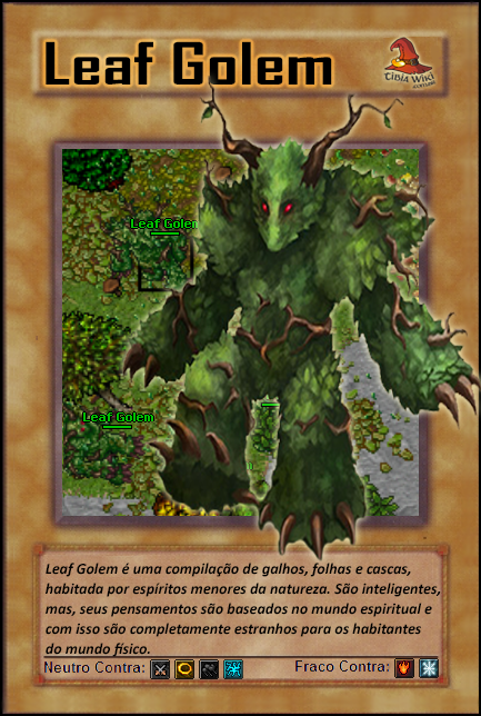 Leaf Golem é um amontoado de galhos, folhas e cascas, habitado por espíritos da natureza. É inteligentes, mas, seus pensamentos são baseados no mundo espiritual. Devido a sua aparência costuma se camuflar muito bem e surpreender aventureiros desavisados que entram em seu território. Por vezes, Small Emerald podem ser encontrada nos emaranhados de matéria orgânica que restam após o espírito deixar a forma física.