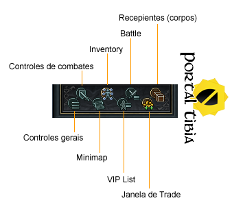 As funções continuam as mesmas. Da esquerda para a direita, os botões abrem as janelas de: Controles Gerais (General Options), Controles de Combate (Combat Controls), Minimapa (Minimap), Inventário (Inventory), Lista VIP (VIP List), Lista de Batalha (Battle List), Trocas (Trades) e Containers.