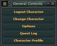 O menu de General Options (controles gerais) dá ao jogador o controle sobre sua seção e seu client. Nas opções deste menu o jogador terá as 5 opções de: fazer logout com o personagem (voltando para uma página com a lista de personagens na conta), mudar o personagem (a mesma janela com a lista se abre, mas sem o logout do personagem atual), Options (opções gerais do client), Quest Log (janela para visualizar o status de suas quests) e por fim uma novidade do client Flash: O Character Profile (perfil do personagem).