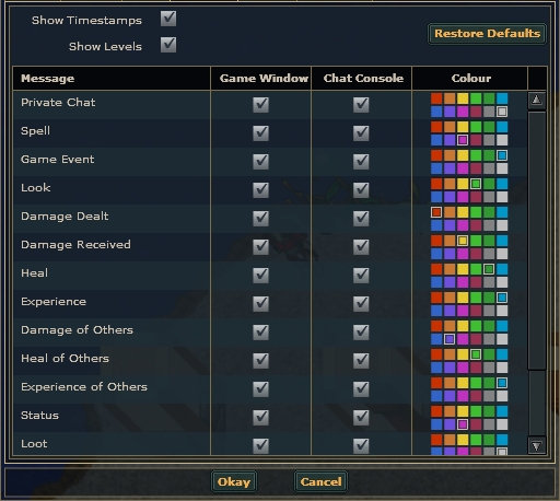 No client em Flash tornou-se possível alterar a cor das mensagens do client. Todo tipo de mensagem pode ter sua cor personalizada com alguma das 12 disponíveis. As opções “Show Timestamp” (mostrar as horas) e “Show Levels” (mostrar o level de outro jogador) continuam as mesmas do client anterior. Ambas permitem, respectivamente, mostrar ou não as horas antes do nome do NPC ou jogador e mostrar o level do jogador.