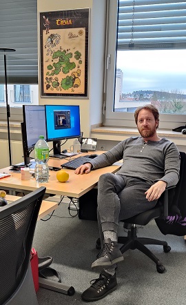 Portal Tibia: Diariamente, como é sua rotina de trabalho? Como exemplo: você trabalha presencialmente a partir da sede da Cipsoft ou você trabalha em casa? Seria ótimo se você pudesse nos enviar uma foto de sua mesa!
