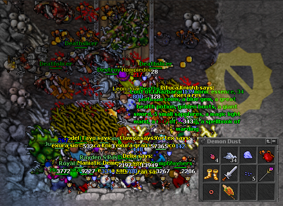 Loot of Ghazbaran: demonic essence, 34 platinum coins, a blue gem, a great health potion, golden boots, a giant sword, 5 small sapphires, a magic light wand, a ring of healing, a spellbook of warding.