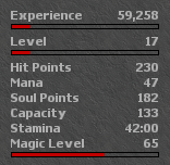 Ele atualmente está no level 17, magic level 65 com gastos cerca de 1.8KK, com mais 50KKs para gastar. Ao começar esta empreitada ele estava com o ML abaixo de 30.