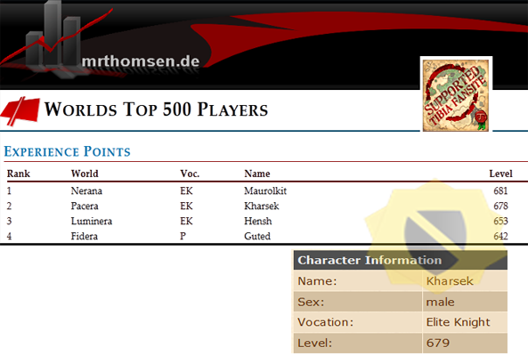 Desde que Tomex of Guardia foi deletado (julho/2013), Maurolkit assumiu o topo do ranking como personagem com mais alto level no Tibia seguido por Kharsek.