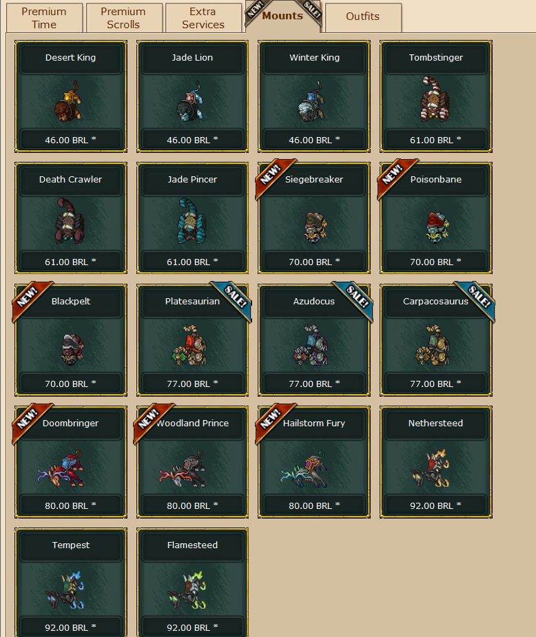 não jogo Tibia desde janeiro/2014… toda vez que entro, sinto menos vontade de jogar e logo saio! só sendo muito retardado pra comprar essas mounts!