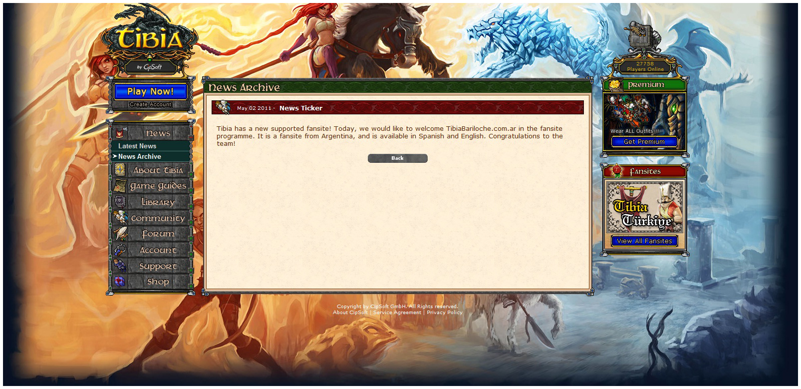 Nesse momento eu já havia entrado em contato com Rejana (da CipSoft) para entrar no programa de fansites, supostamente sendo avaliado por um período de 6 meses (foram por volta de 7-8 meses devido a diversas mudanças no Tibia Bariloche). Nesse período nós melhoramos o site, mas eu ainda não tinha conteúdo o suficiente ou design comparado com outros fansites que faziam parte do programa oficial.