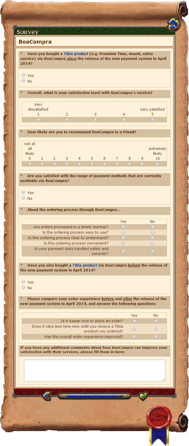 Agora, após nove meses da mudança, a CipSoft quer saber o que os jogadores acham do serviço e se estão satisfeitos. E, no survey atual, os jogadores sorteados foram convidados a responder sete perguntas sobre os seguintes pontos: