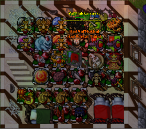 Casa do jogador Val’Mukka (198) de Danera, junto com o seu Epaminondas Doll obtido através do sistema de recompensas do Portal Tibia.