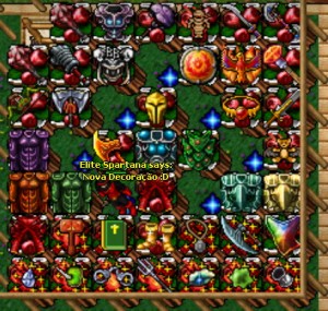 Jogador Elite Spartana, de Calmera, mostrando a nova decoração da sua casa com um Golden Helmet, um Solar Axe, um Great Shield, um Thunder Hammer, duas Demon Legs, entre muitos outros rares.