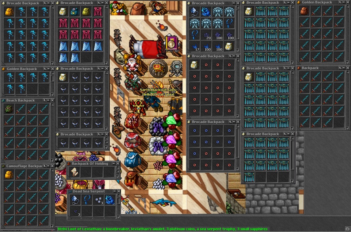 Loot completo após uma hunt de sea serpents (2000 mortas) + o boss Leviathan. Belo lucro! 😀