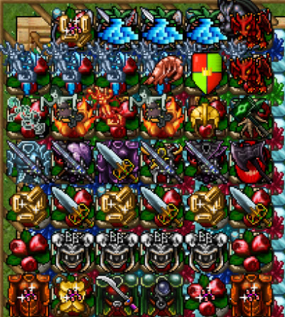 Casa do jogador Eternal’piko de Menera. Entre os rares, podem ser encontrados 4 necromancer shields, 4 emerald swords, além de outros itens.