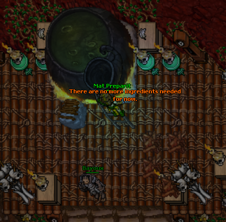 Por quatro dias, os tibianos trabalharam exaustivamente para preparar a mistura e manter os Bane Bringers longe do caldeirão. E aí está o resultado! A mistura já está completa! Mais algumas horas e ela estará pronta. Podem comemorar!