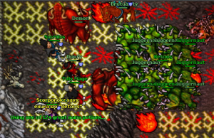 Jogador Betows, elite knight level 387 de Honera, blocando 8 Juggernauts na last room do Inquisition Quest.