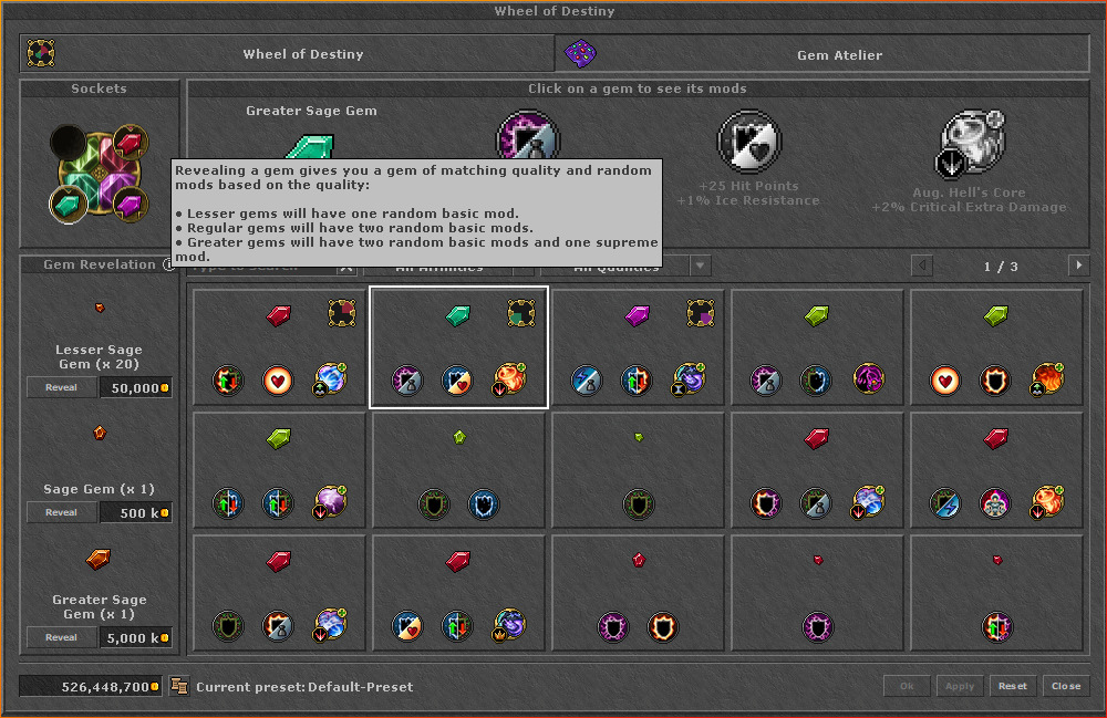 Exemplos de Mods Básicos e Supremos podem ser encontrados mais adiante no texto; uma lista completa iria além do foco deste teaser. As gemas também são categorizadas em quatro cores distintas, cada uma significa o domínio da roda no qual elas podem ser estrategicamente posicionadas.Em nosso cenário, adquirimos e identificamos com sucesso uma Regular Sage Gem, um tipo de gema exclusivo da vocação de Sorcerer. Posteriormente, nós a colocamos no slot correspondente localizado no domínio superior direito da Wheel of Destiny.
