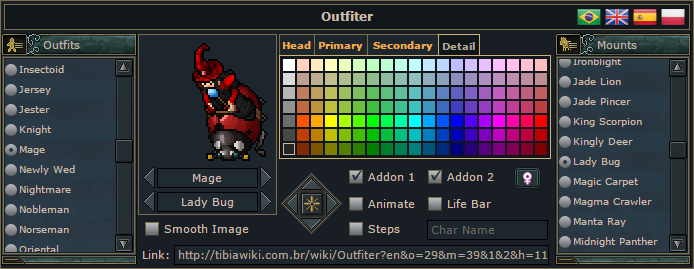 After months working, they are ready to officialy release the first Brazilian Outfiter, a tool that will allow players to test all the Outfits and Mounts available ingame and share them with their friends right from Tibia Wiki!