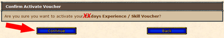 Você receberá a confirmação da ativação do voucher de double XP/Skills. Note que a contagem do período do benefício começa durante seu próximo login no jogo.