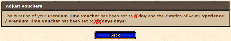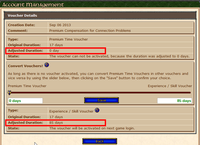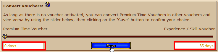 Nossa, fico até meio desacreditado com essa compensação! Então quer dizer que se eu converter todos os meus dias de Premium Time Voucher (17) para dias de Experience / Skill Voucher (85) e ativar 3 Premium Scrolls vou ter quase 3 meses de Premium com Double Xp/Skill???? =O ²